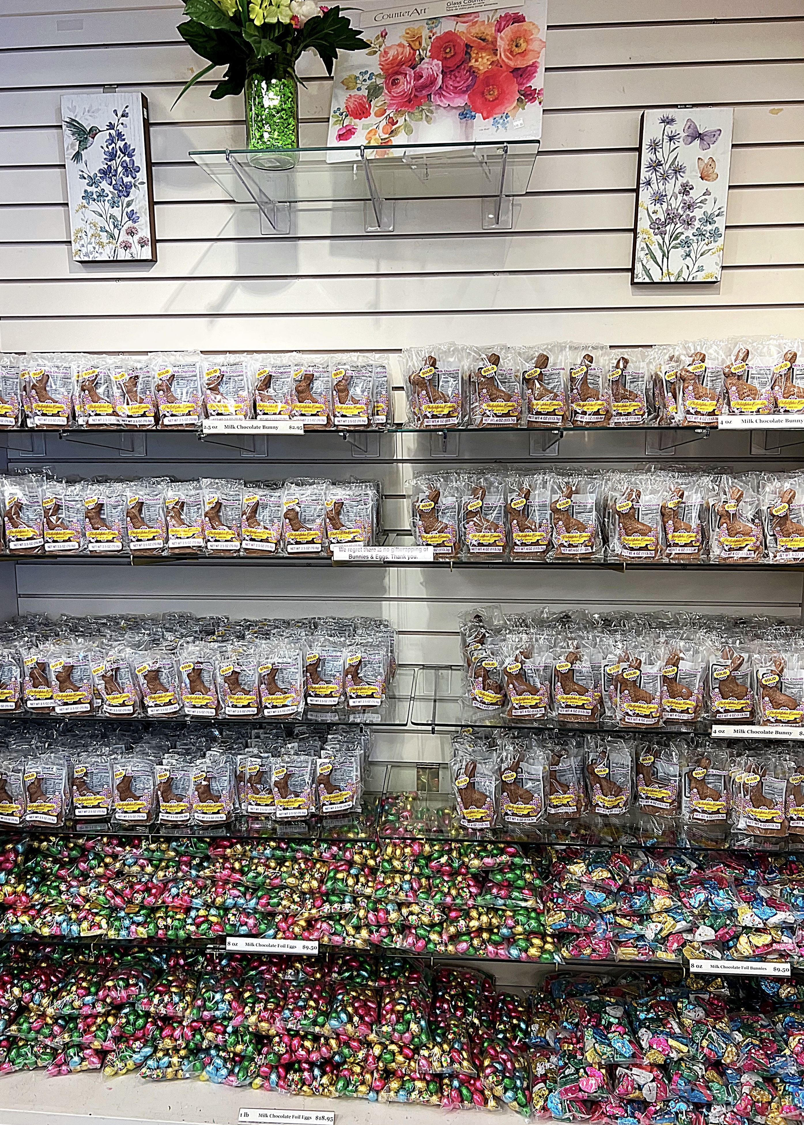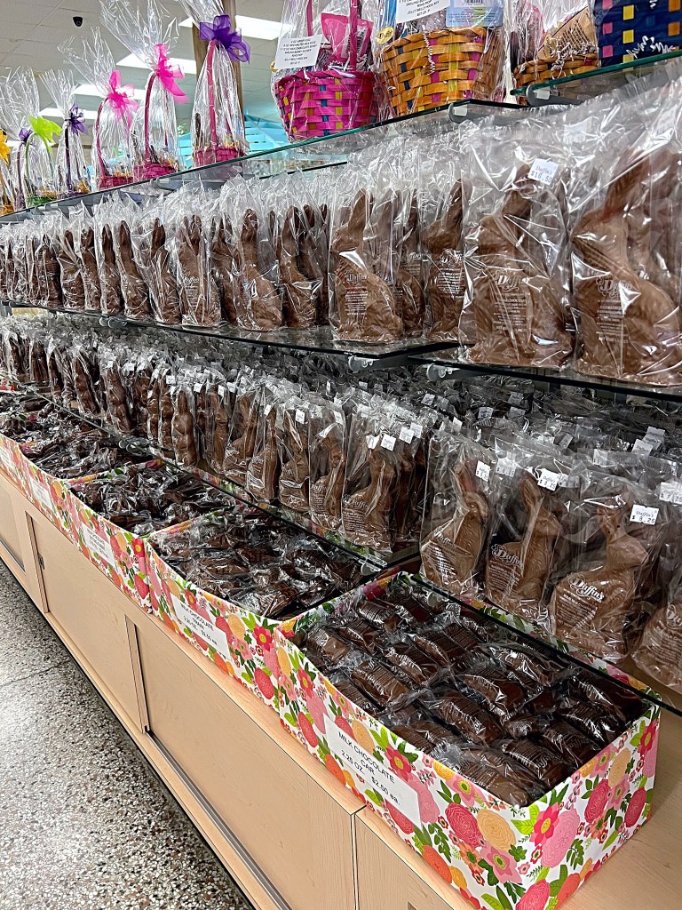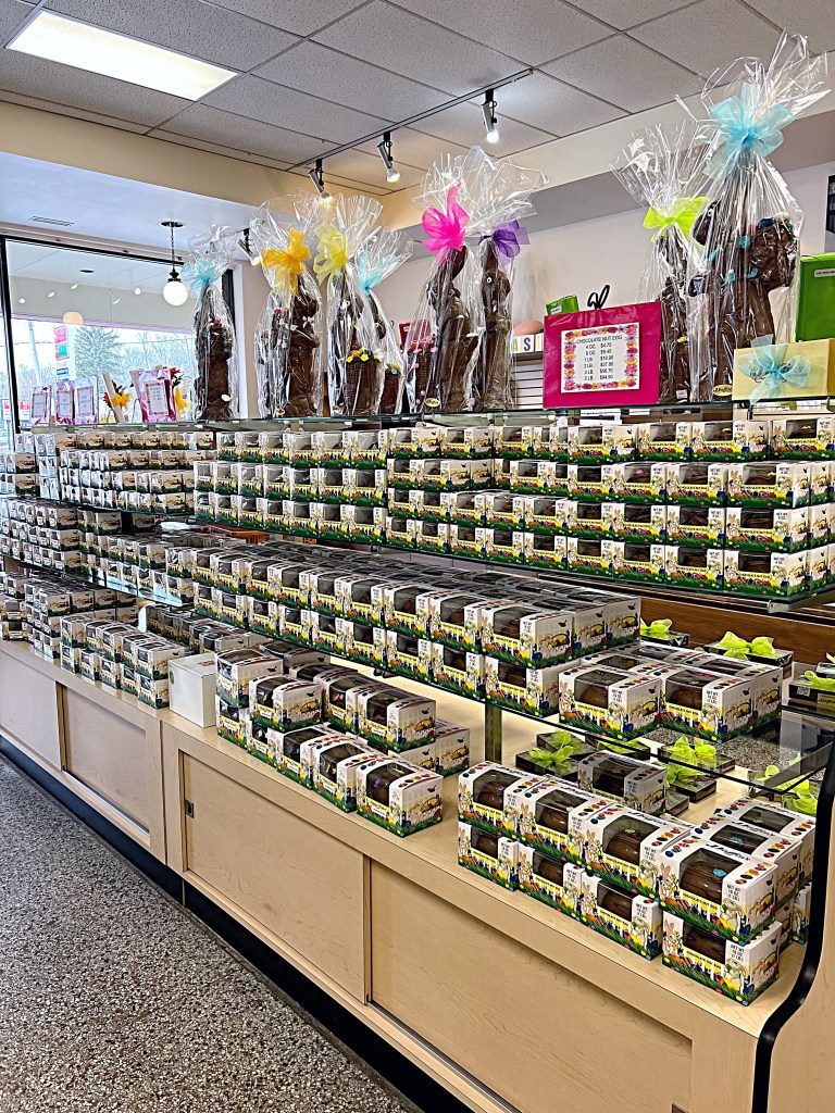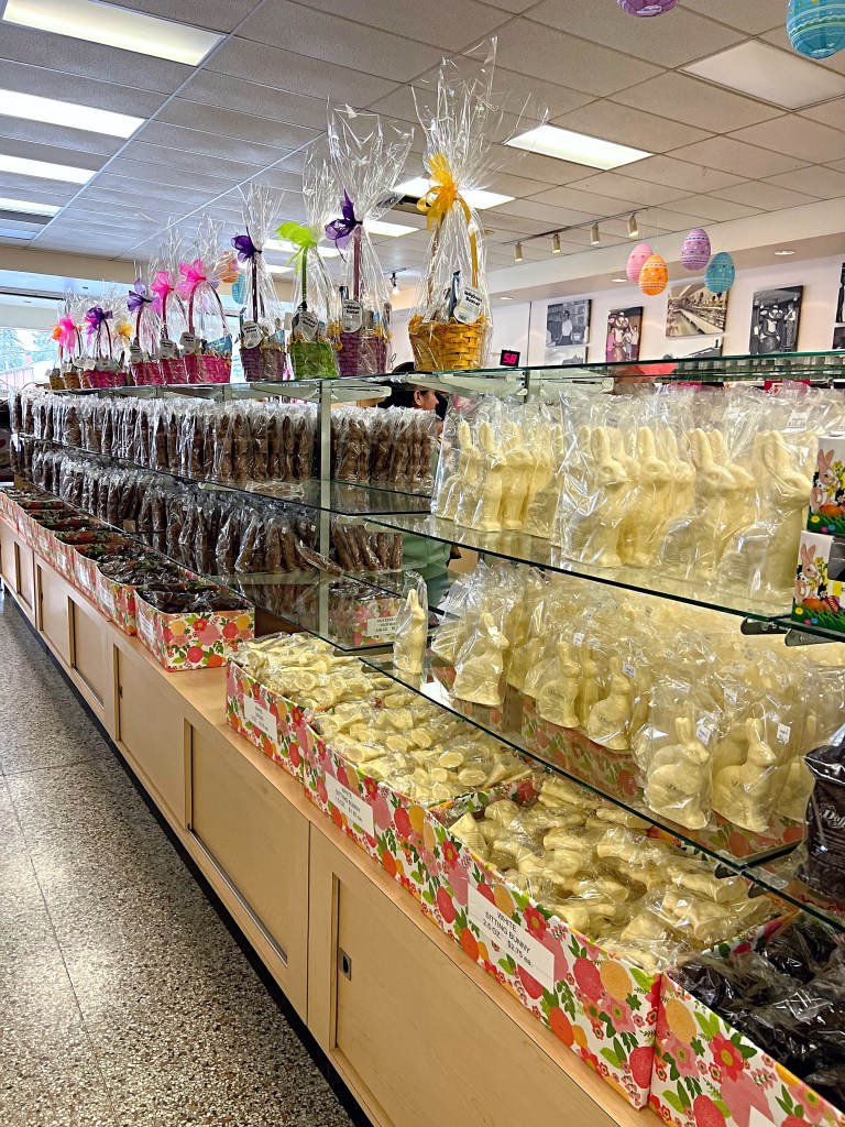 For Easter, they have a wide variety of chocolate in every spring/Easter shape you can think of…plus more. Their filled eggs are also very popular and come in a variety of flavors. And don’t forget to check out the display cased full of sweets sold by the pound.