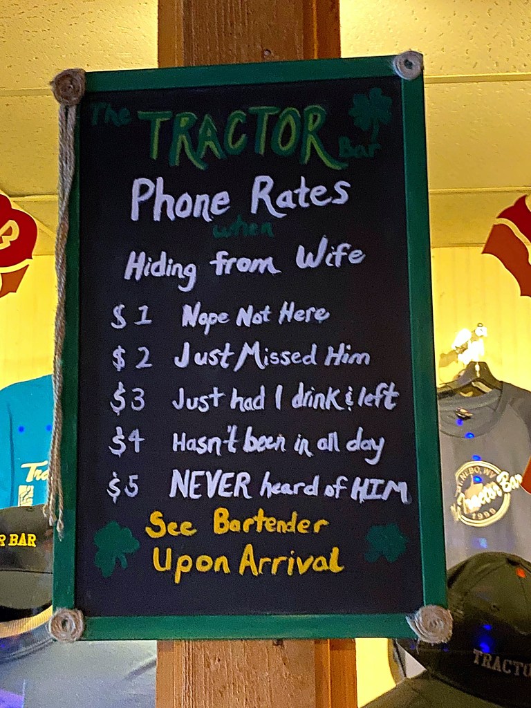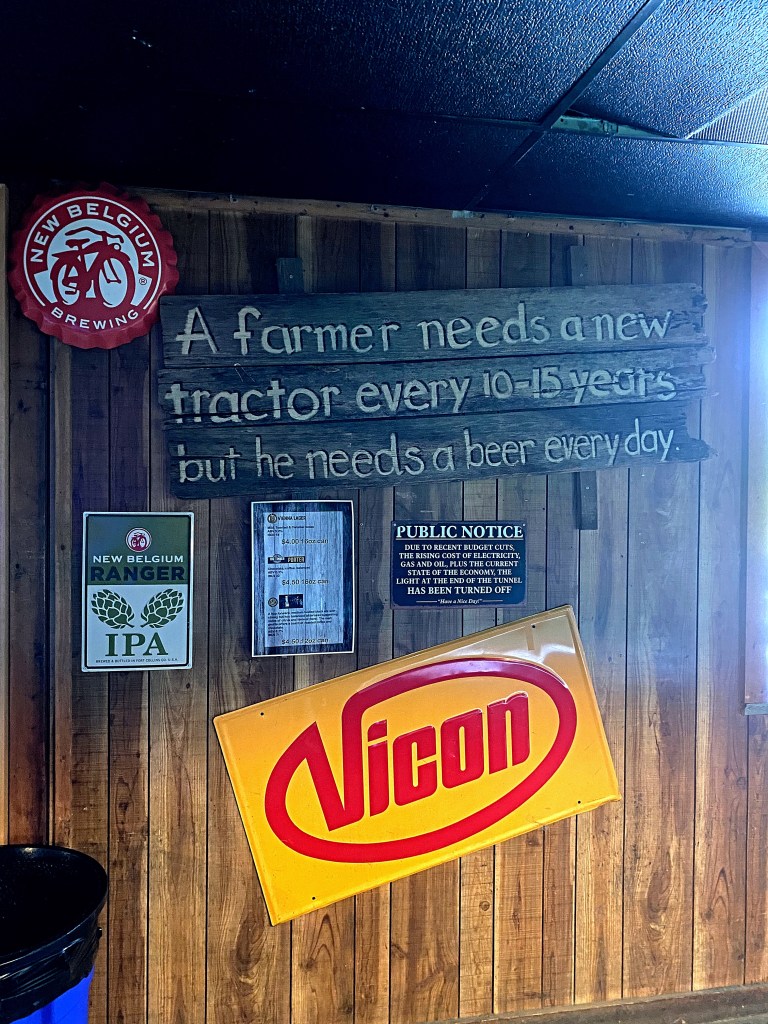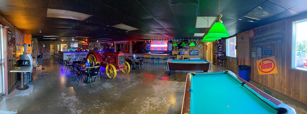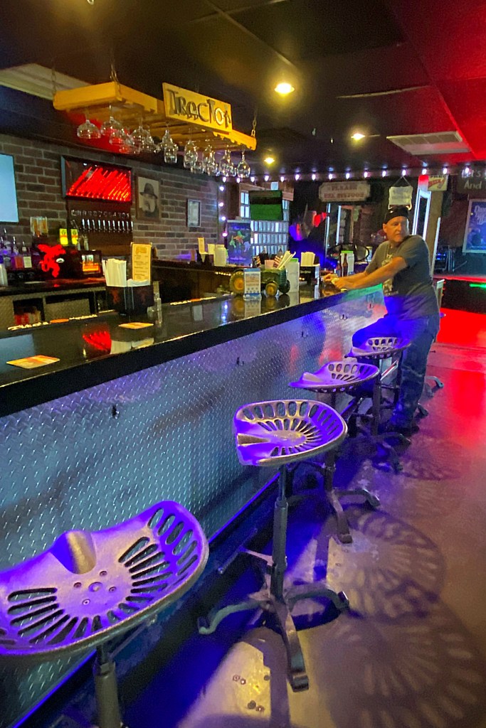 It turns out, The Tractor Bar, was an actual tractor dealership back in the early 90’s. After hard times fell upon the business, the owner decided to turn it into a bar. But the money was tight, so the bar and decor were pieced together from things laying around the tractor dealership. In fact, the beautiful red tractor in the middle of the bar was sitting in the weeds behind the dealership before they dragged it out, gave it a good cleaning and paint job and turned it into the centerpiece of the bar.