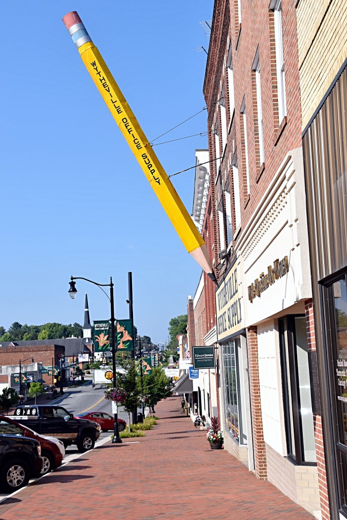 Next stop, Main Street to get some pictures of the famous “big pencil” that hangs on the outside of the Wytheville Office Supply Store. It’s not hard to find this roadside attractions since the metal pencil is approximately 30 feet long.