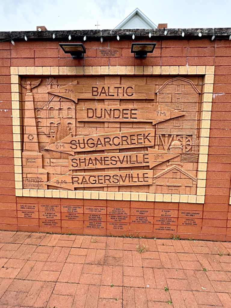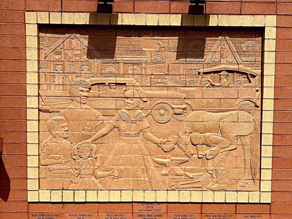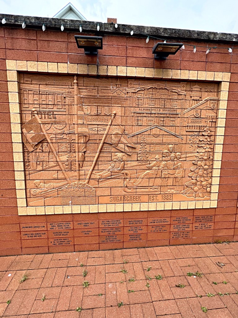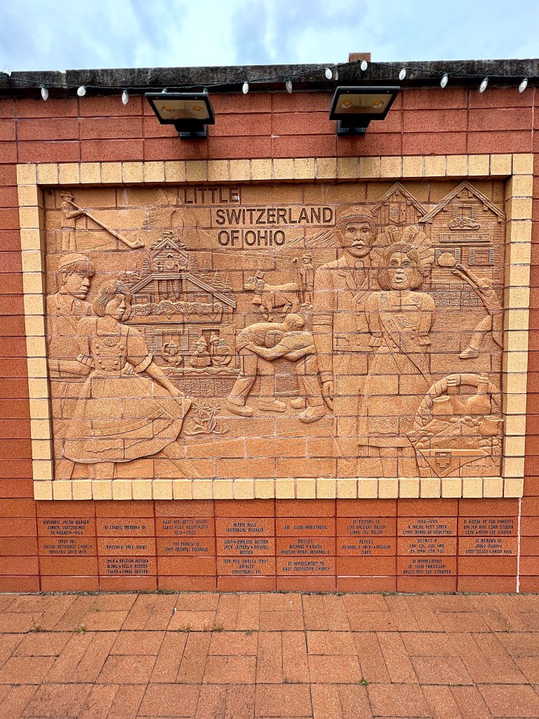 Across the street from the Cuckoo Clock is a brick wall containing 13 sculpted brick panels that depict the story of Sugarcreek and the surrounding area. The panels were designed and sculpted by a local artist, Sherry Crilow.