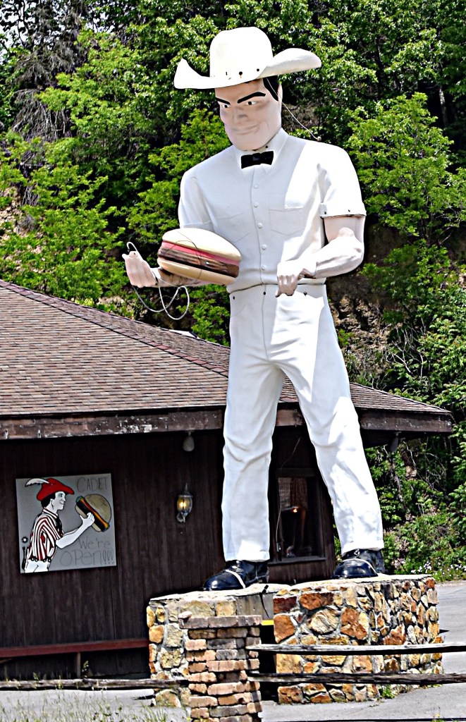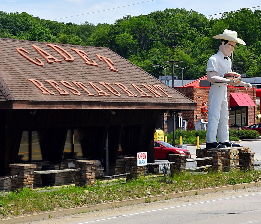Next we headed back north on US-422 to stop at a The Cadet Restaurant who has a unique mascot, “Sam”. Sam is the reason this restaurant was added to my list. He is a 30-foot-tall cowboy statue holding a giant hamburger. This iconic statue was even featured in book “Roadside Giants“. According to the restaurants website this larger than life cowboy got his name from an officer that used to patrol the parking lot to keep an eye out for trouble. For more about the restaurant, and Sam’s history check out the Cadet Restaurant website.