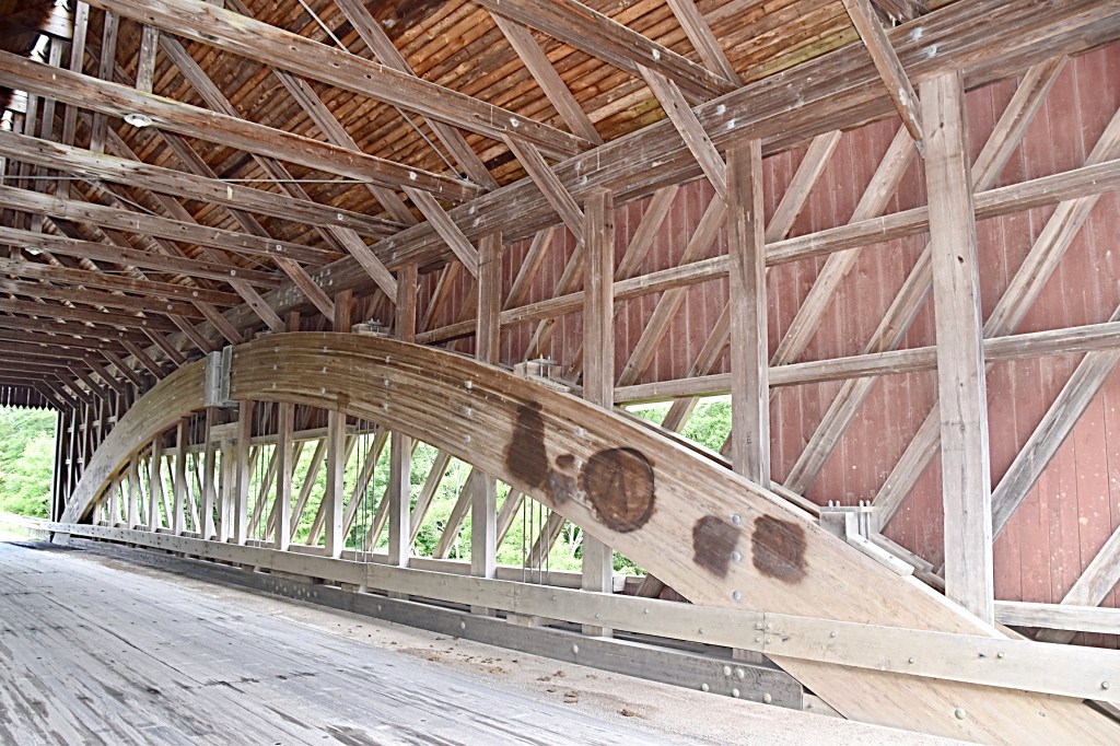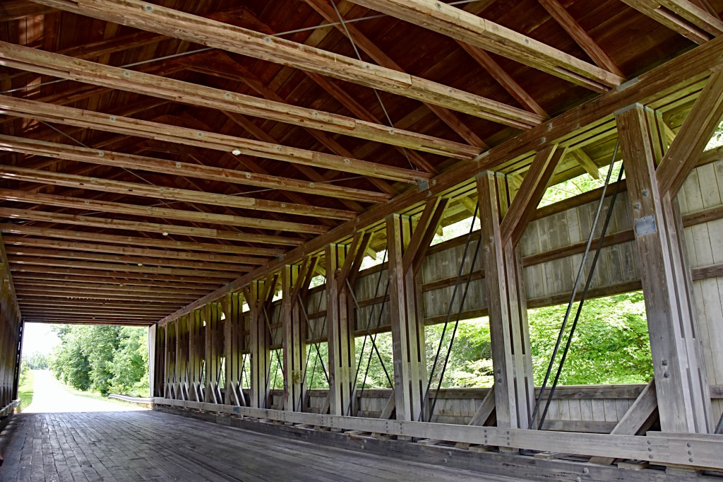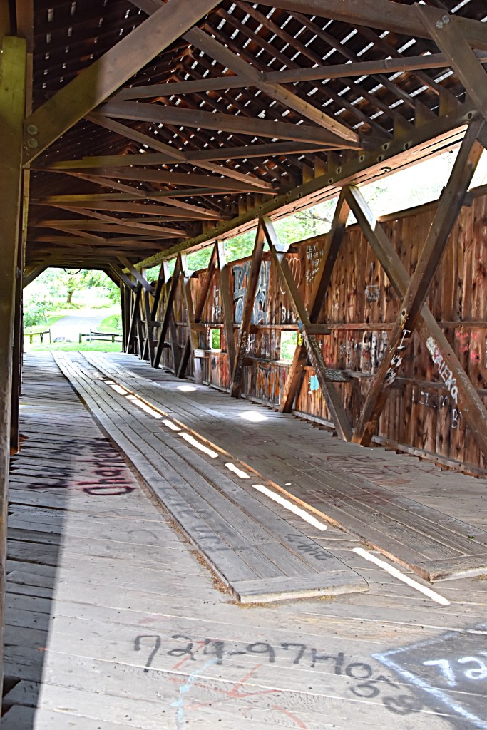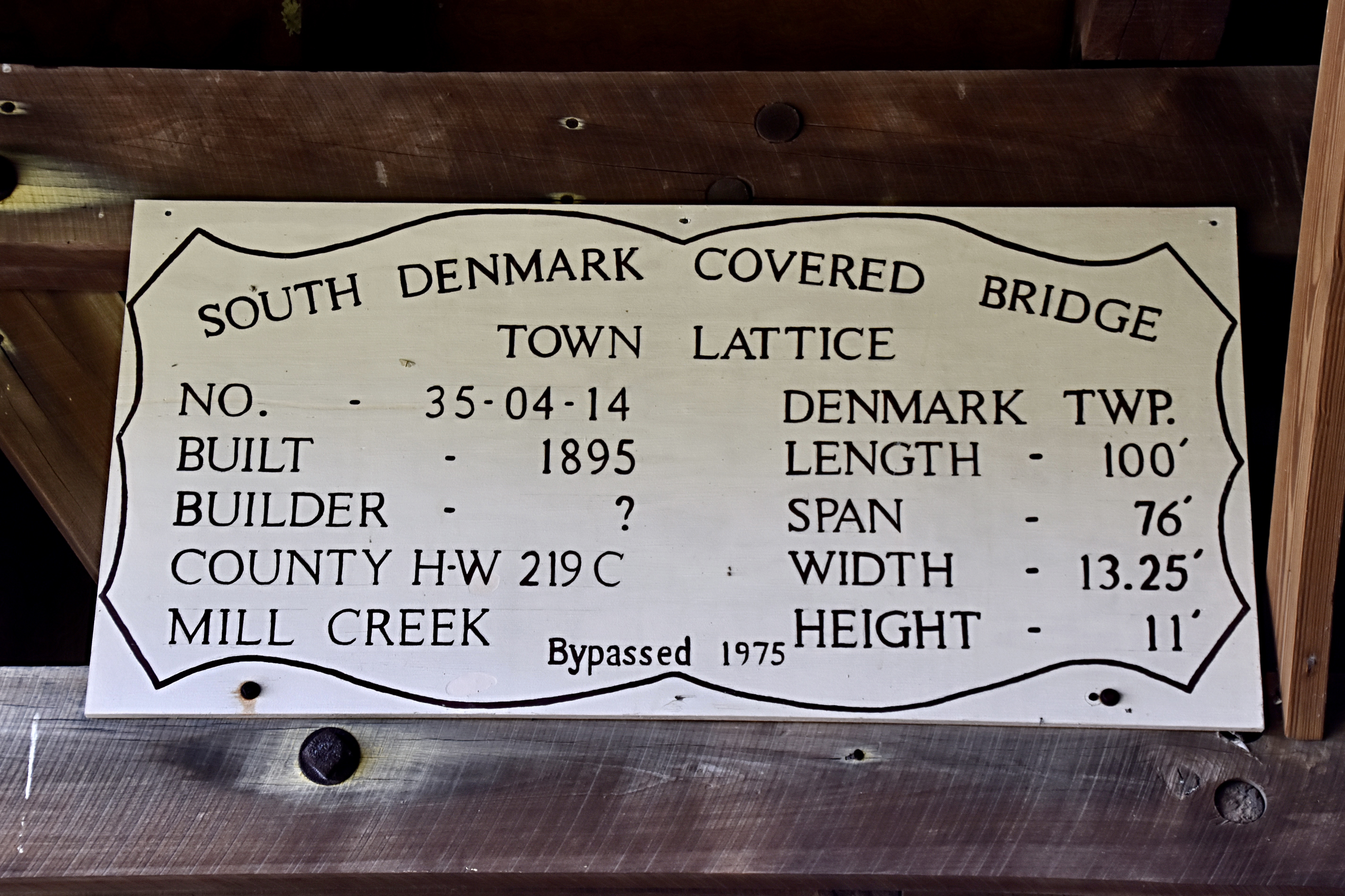 The South Denmark Covered Bridge is 100 feet long with a span of 76 feet, 13.24 feet wide and 11 feet high.