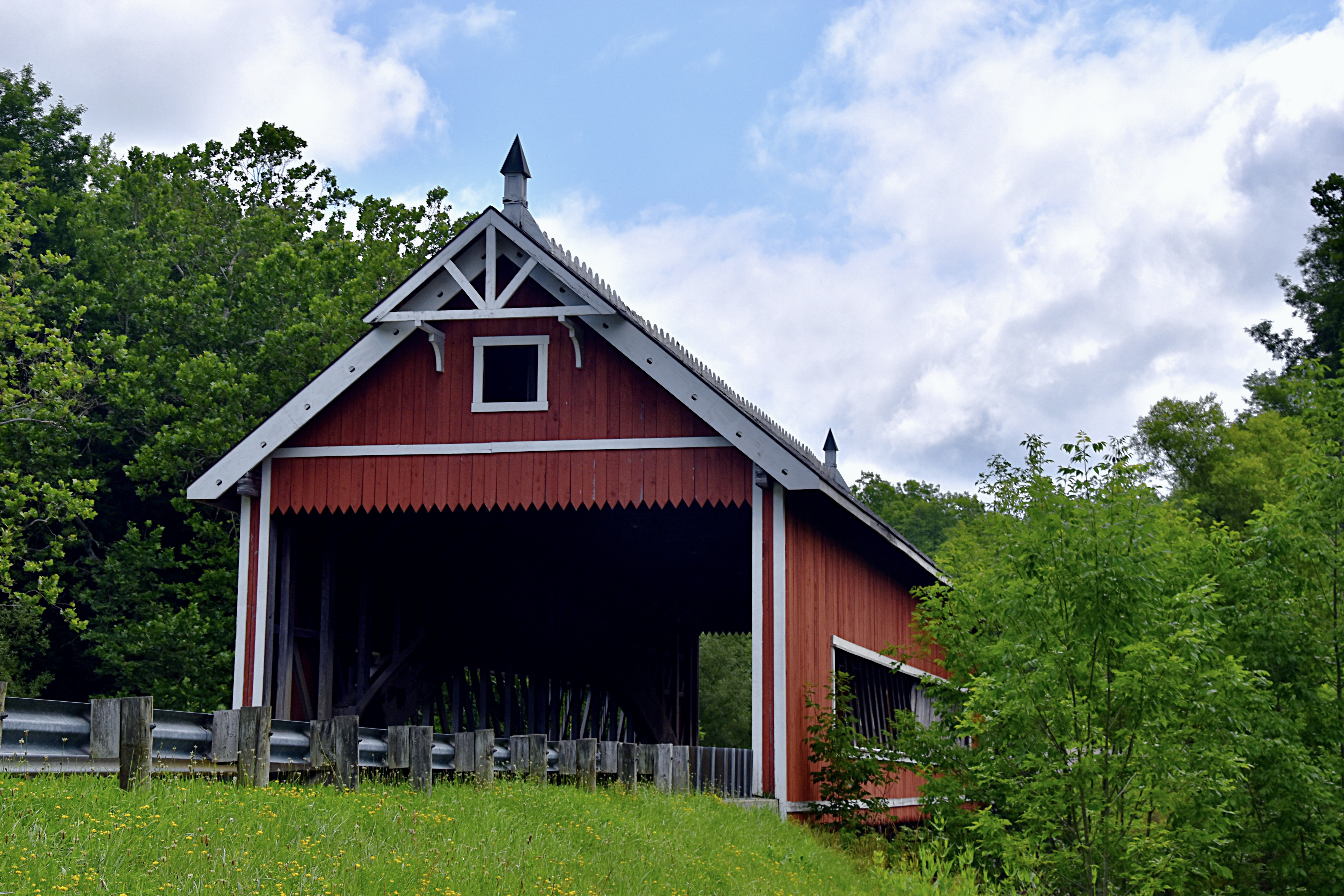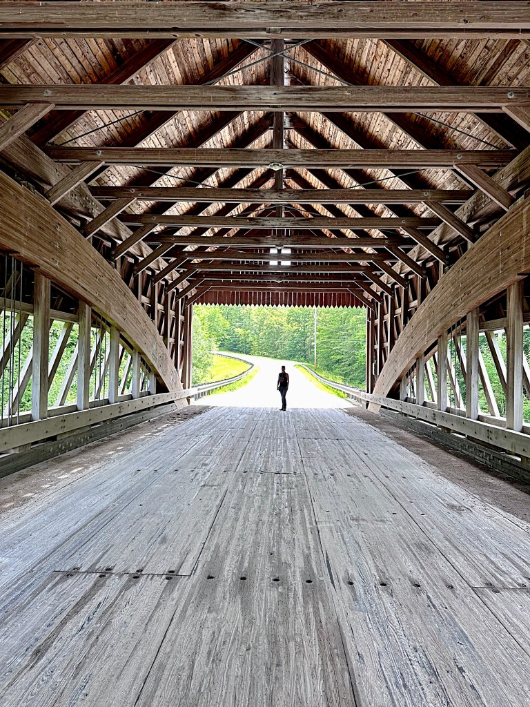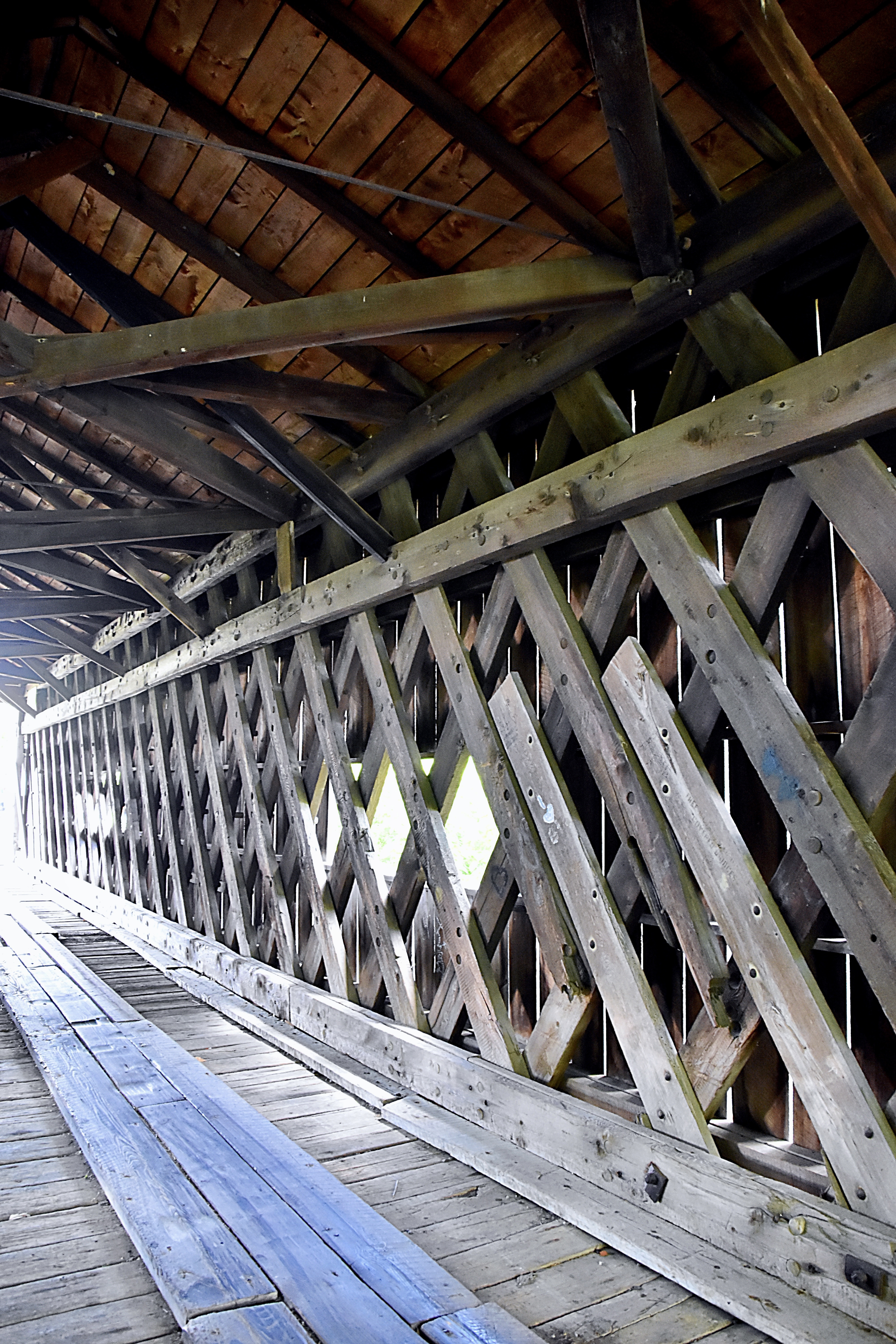 The South Denmark Covered Bridge is 100 feet long with a span of 76 feet, 13.24 feet wide and 11 feet high.