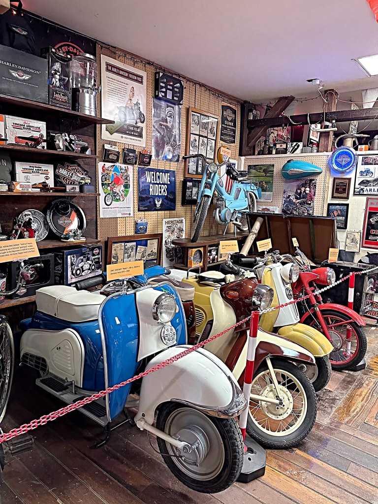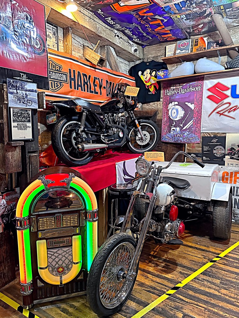 The museum has over 60 bikes, promotional items, memorabilia and much more. Although their passion began with Harley Davidson items, the museum encompasses many more brands and anything that has to do with motorcycles.