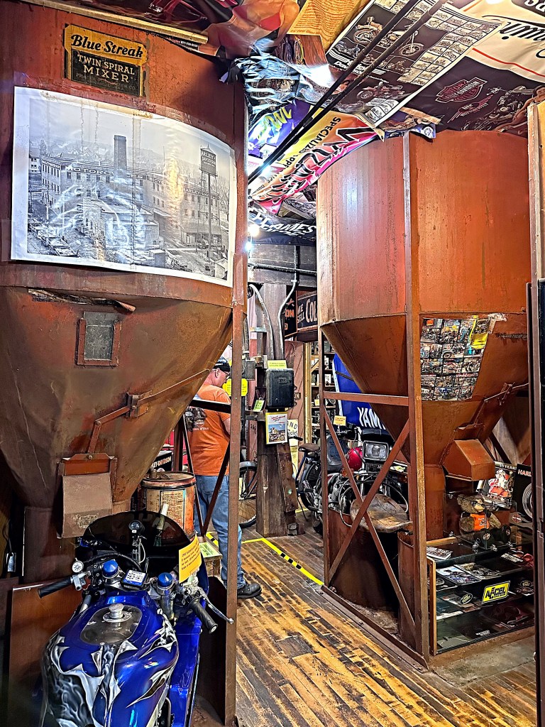 Recently we took a ride out to Ravenna, OH to check out Bear’ s Vintage Motorcycle Museum. The museum is in a historic grain mill built in 1881. In 2006 Bear and his wife purchased the building and preserved the bins, shuts and machinery. As they put the museum together they put the items around the original pieces of the mill.