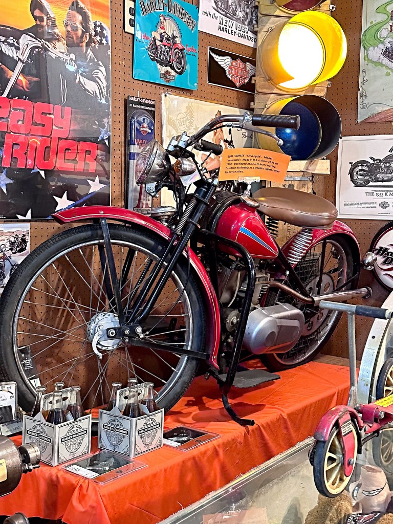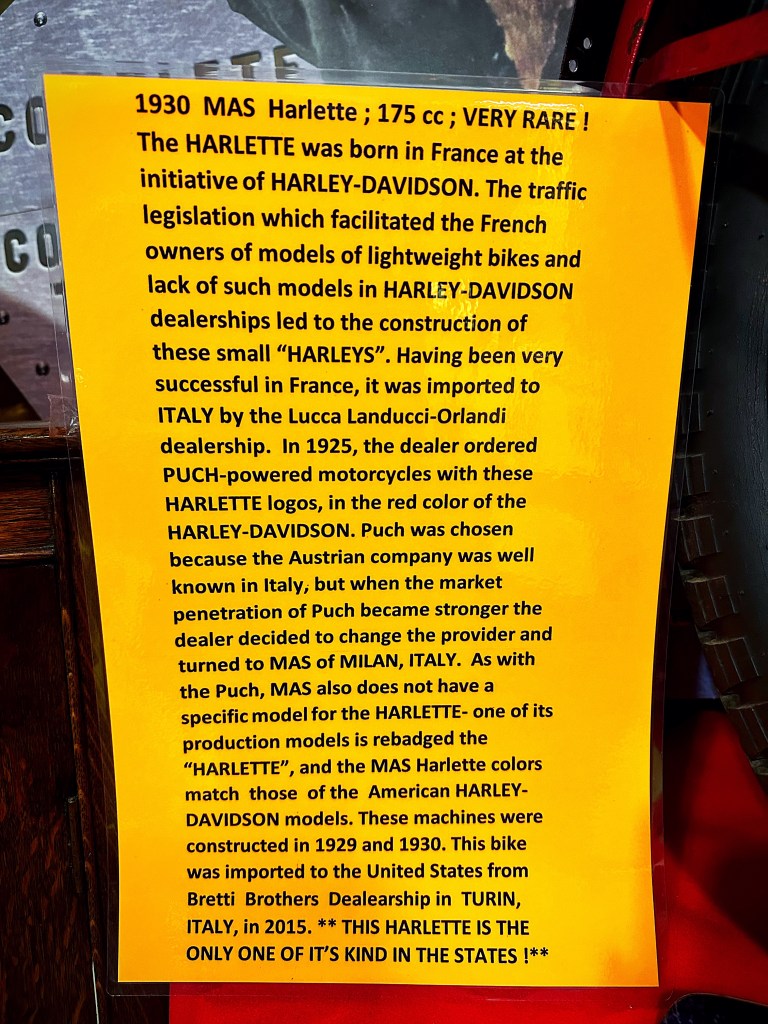 The Harlette bike was a very interesting story. He was especially proud of having this one in his collection because it is the only one in the US. Check out the picture below for more about the bike. Bear and his wife also do an awesome job of writing up and labeling the items in the museum.