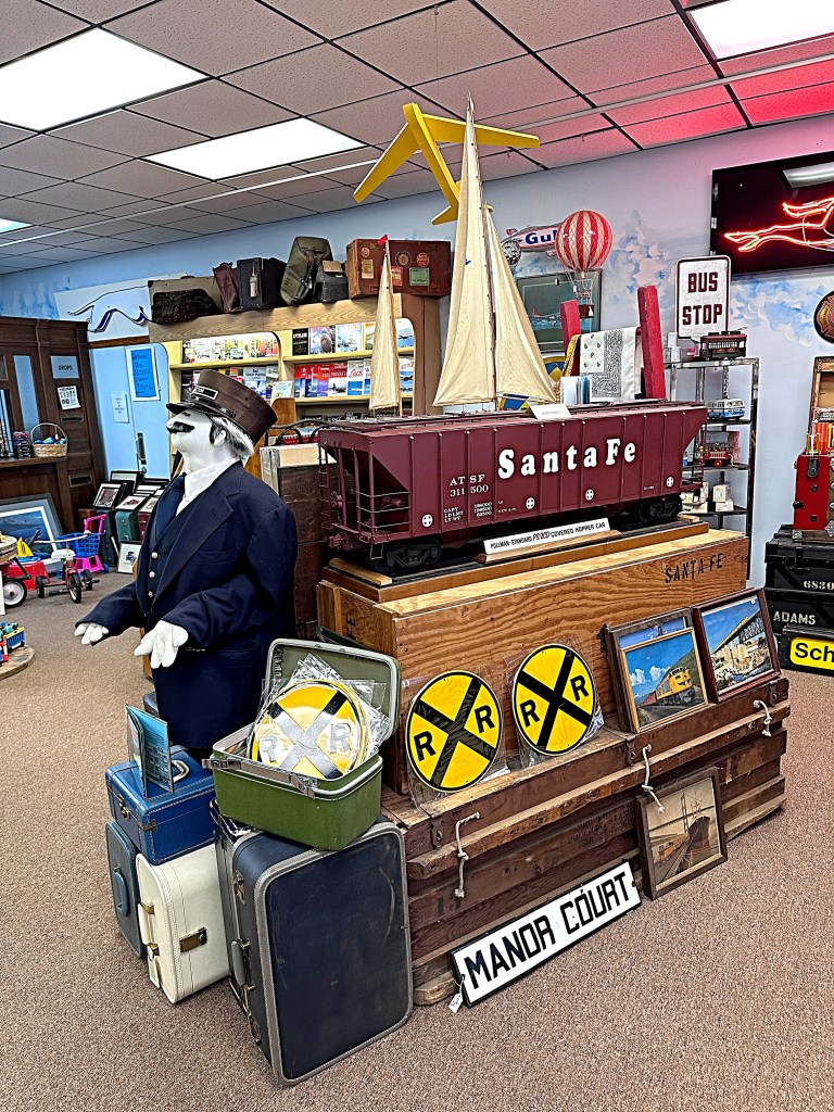 The train station and rail cars contain transportation related artifacts and memorabilia that include trains, Air Force, nautical, motorcycle and more.