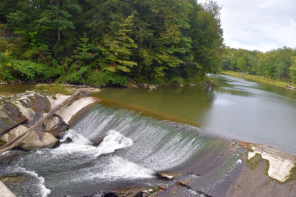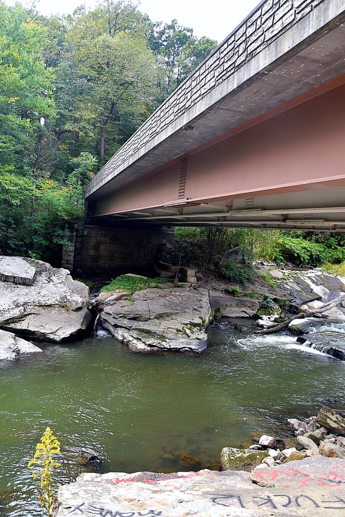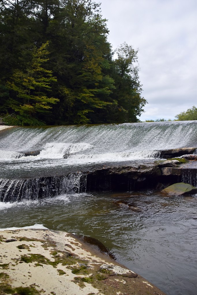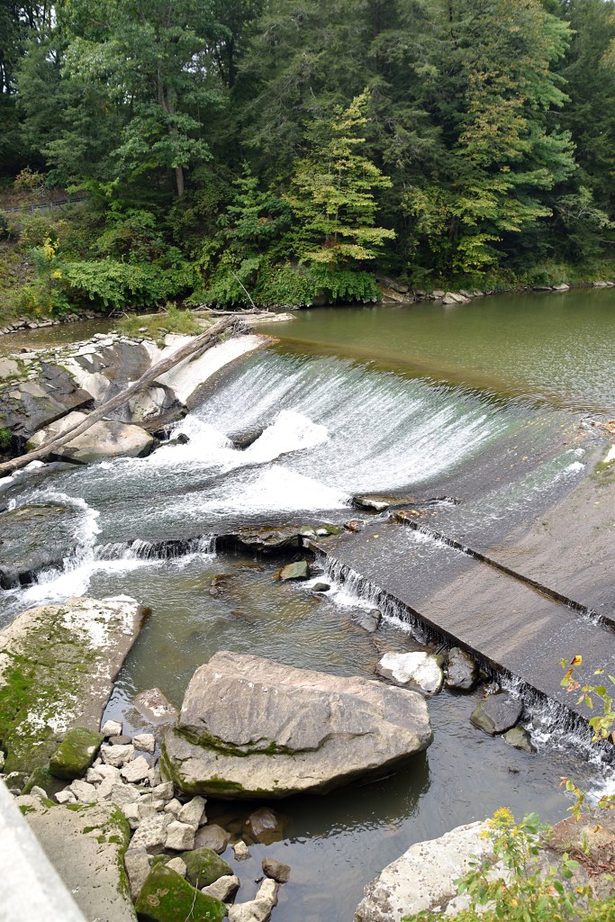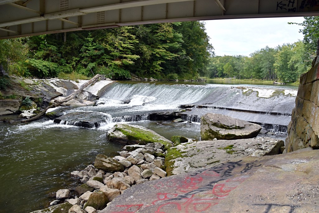 After the museum we headed south to Frew Mill Road. The road crosses a bridge spanning the Slippery Rock Creek and an old mill dam waterfall.